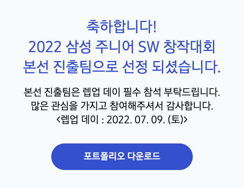 | 2022 삼성 주니어 SW 창작대회 - 2 (0) | 2022.12.01 |