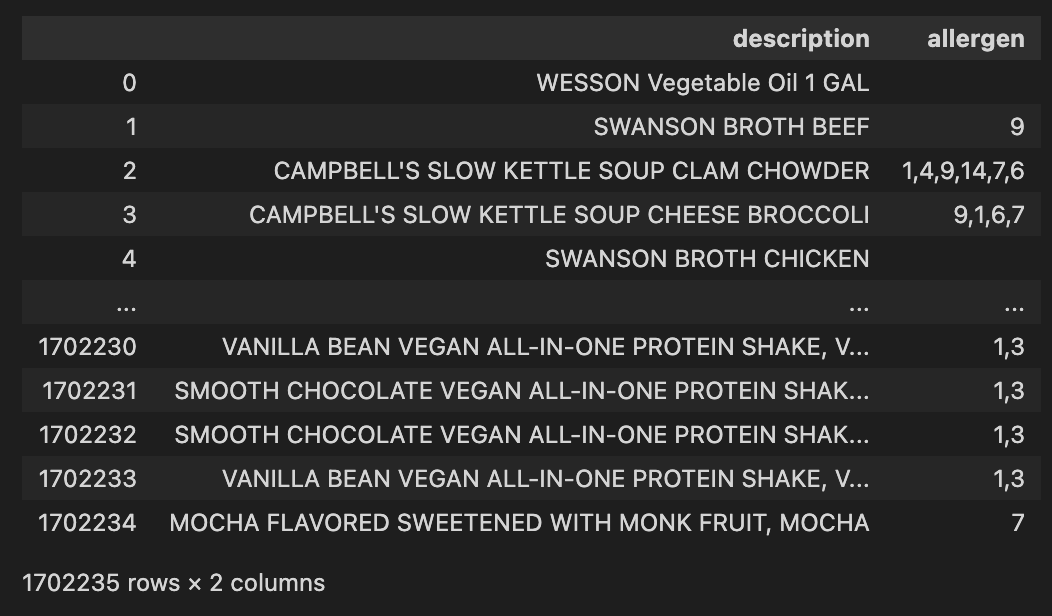 원본 식품 데이터는 2GB대였다. 중복 데이터 클러스터링을 마치니 784.5MB가 되었다. 하지만 Swift Student Challenge 결과물의 크기 조건은 25MB였다. 택도 없었다. 벌써부터 막막해지기 시작했는데, 무언가를 떠올리고 pandas를 켰다.