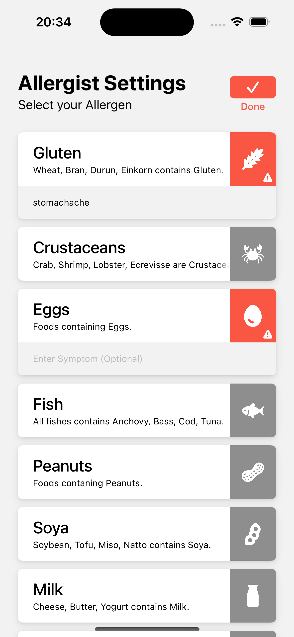 앱을 최초로 실행하면 좌측 화면이 뜬다. 바로 사용자의 알레르기 선택 화면이다. '알레르미'에서 조금 업그레이드시켜 노출 시의 증상도 입력할 수 있게 만들었다. 밀, 갑각류, 난류, 생선류, 땅콩, 대두, 우유, 견과류, 셀러리, 겨자, 깨, 아황산염, 루핀, 연체동물류가 있다.