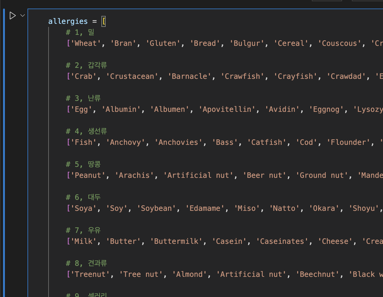 우선 원재료 경우의 수를 수집했다. 원재료 칼럼의 값을 콤마로 나누고, 나온 값을 클러스터시킨 후 미국 현지의 알레르기 정보 분류법칙에 의거해 해당되는 알레르기의 숫자의 배열을 구했다. 예를 들어서 밀은 1, 갑각류는 2. 이 두 알레르기가 있으면 [1, 2]였다.