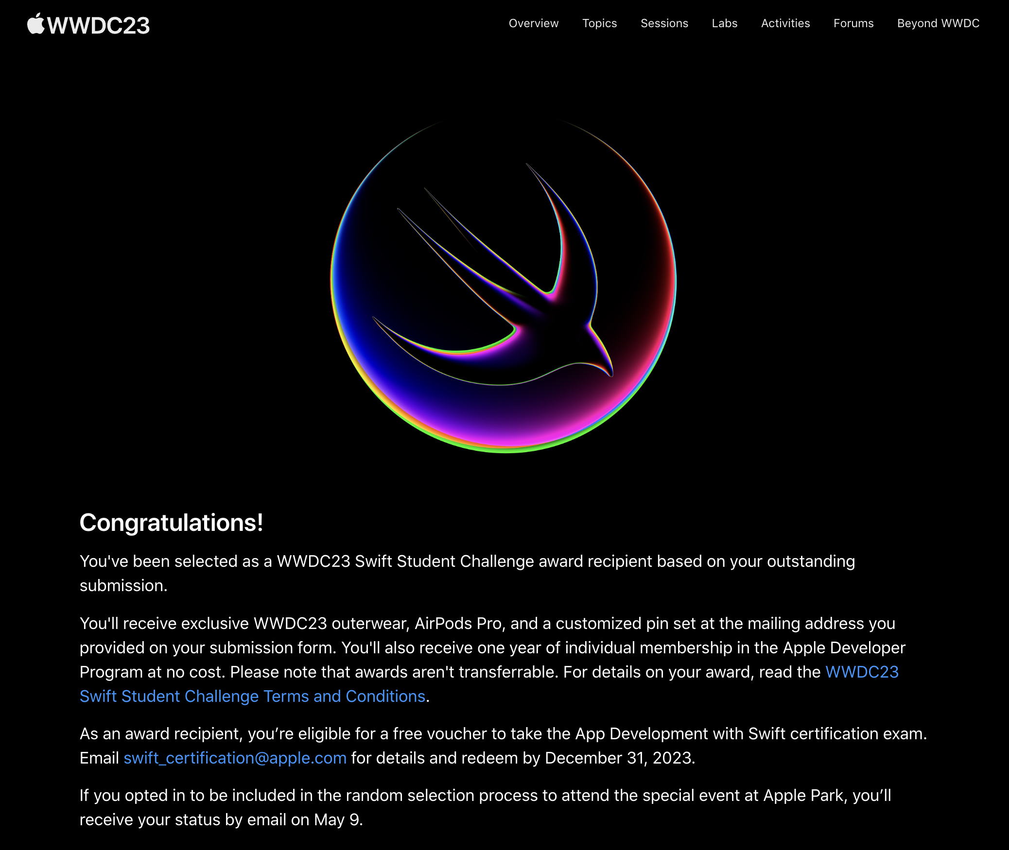 개발을 완료하고 약 1달 후, 이메일이 날아왔다. 이 때까지도 솔직히 자신이 없었다. 최선을 다해 개발하긴 했지만 전 세계에서 350명밖에 선발하지 않기도 하고, 당시 iOS 개발을 시작한지 1년도 되지 않았을 때라 실력에도 자신이 없었다. 그런데...