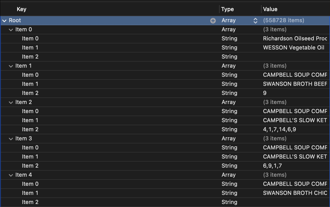 원본 식품 데이터는 2GB대였다. 중복 데이터 클러스터링을 마치니 784.5MB가 되었다. 하지만 Swift Student Challenge 결과물의 크기 조건은 25MB였다. 택도 없었다. 벌써부터 막막해지기 시작했는데, 무언가를 떠올리고 pandas를 켰다.