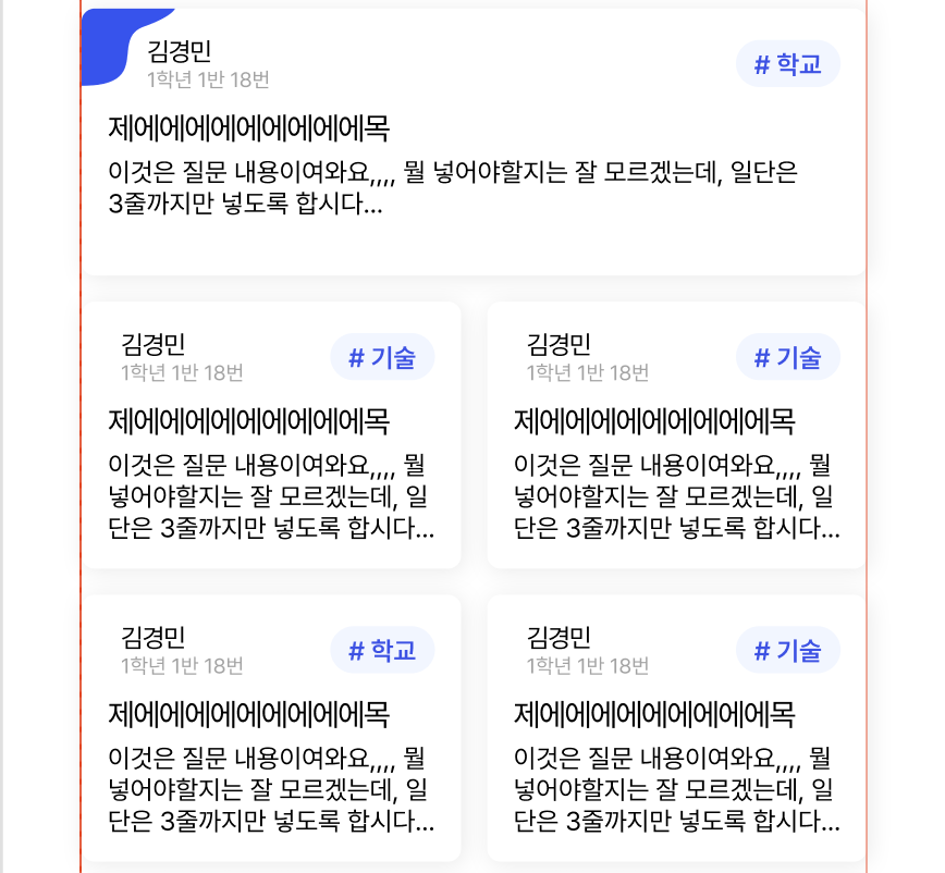 메인 화면 디자인을 보자마자 뇌정지가 와 버렸다. 형태는 같은데 이런 식으로 뷰를 짜려면 어떻게 해야 할지 막막했다. 한 개는 크게, 네 개는 작게라니. 그래도 디자이너 말에 토 달수는 없고 어쩔 수 없이 만들기 시작했다.