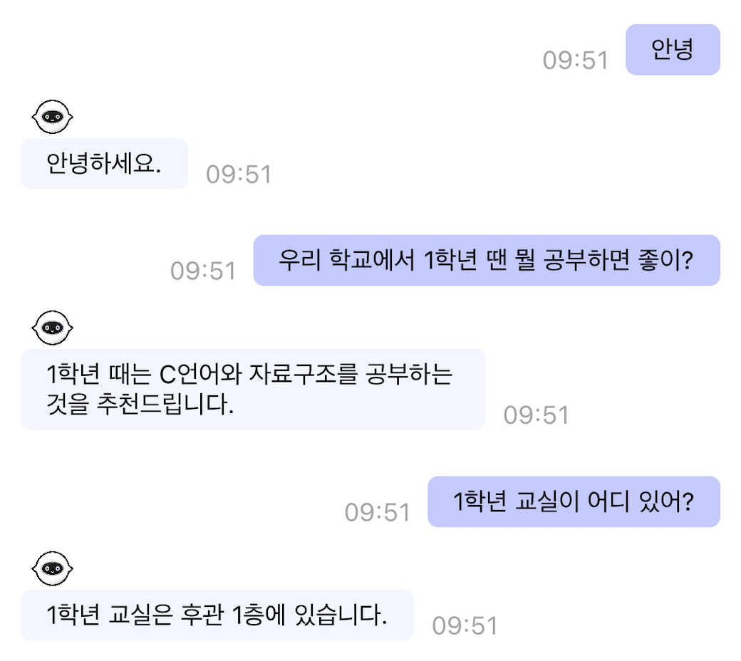 주제는 '신입생들을 위한 서비스'였다. 생각보다 어려운 주제는 아니었다. 이미 신입생들을 위한 서비스를 개발한 경험이 있었기 때문일 것이다. 커뮤니티, 채팅 앱 등 많은 아이디어들이 나왔지만 학교에 대한 궁금한 점을 물어볼 수 있는 AI 챗봇으로 결정되었다.